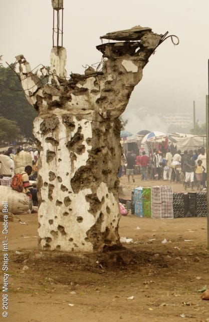 For example, the port was guarded by UN officials. They sat behind barricades and barbed wire, dressed in fatigues, helmets, bulletproof vests, and boots, with AK-47s strapped across their backs. Bullet holes pierced numerous lampposts and buildings. Sunken ships were left to rust in the harbor, and trash piled up along the riverbanks and marketplaces. The roads, filled with potholes and puddles, looked more like dried-up creek beds than streets.